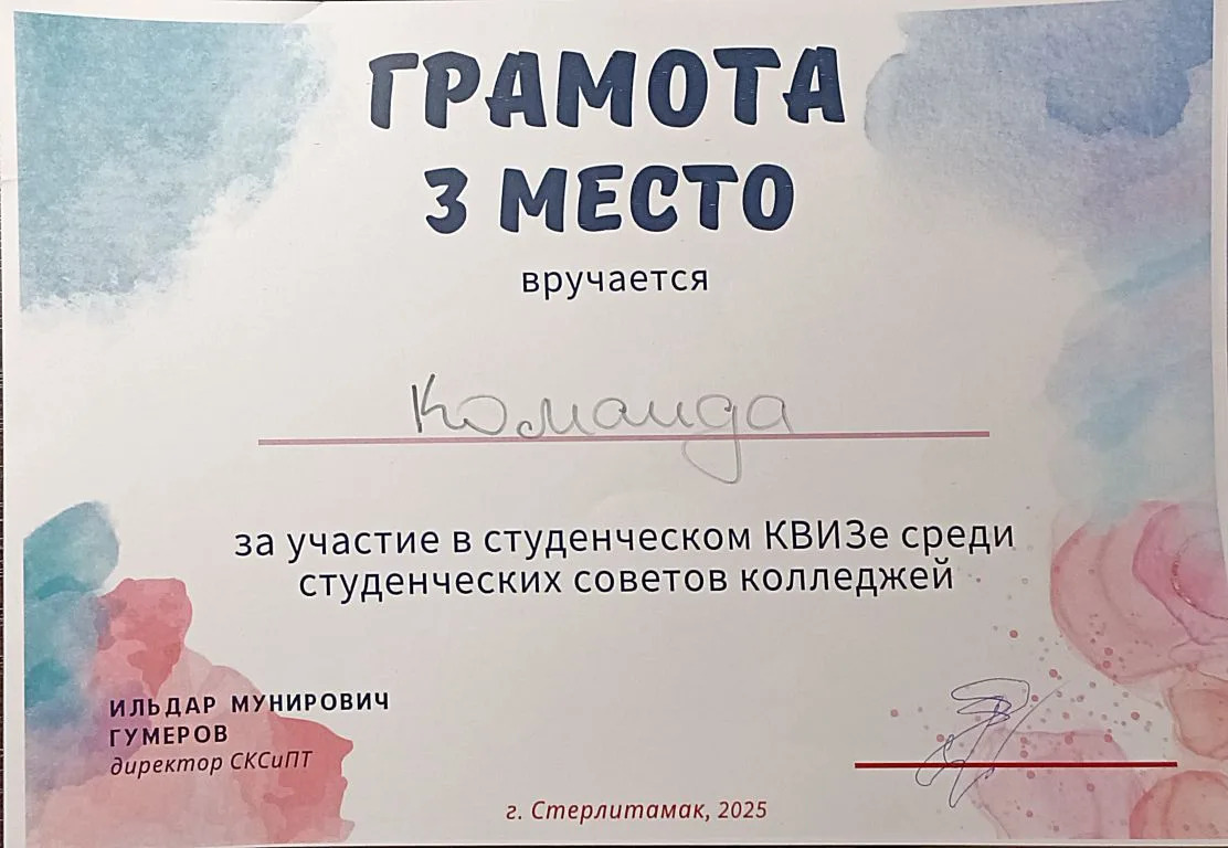 Согласно календарного плана третьего этапа Комплексной Спартакиады среди профессиональных образовательных организаций Республики Башкортостан с 5 по 7 ноября 2024 года в городе Стерлитамаке прошли финальные соревнования по стрельбе из пневматической винтовки. Приняло участие 15 сильнейших команд, победители второго этапа, и завоевавшие право участвовать в республиканских соревнованиях. Команда нашего колледжа заняла 9 место. В состав команды вошли спортсмены студенческого спортивного клуба "Медик" Салимова Диана, Янбеков Сабир, Лазарева Александра, Габидуллин Анур и Бикбов Тимур. Поздравляем команду Стерлитамакского медицинского колледжа с результатом и желаем успехов и побед!