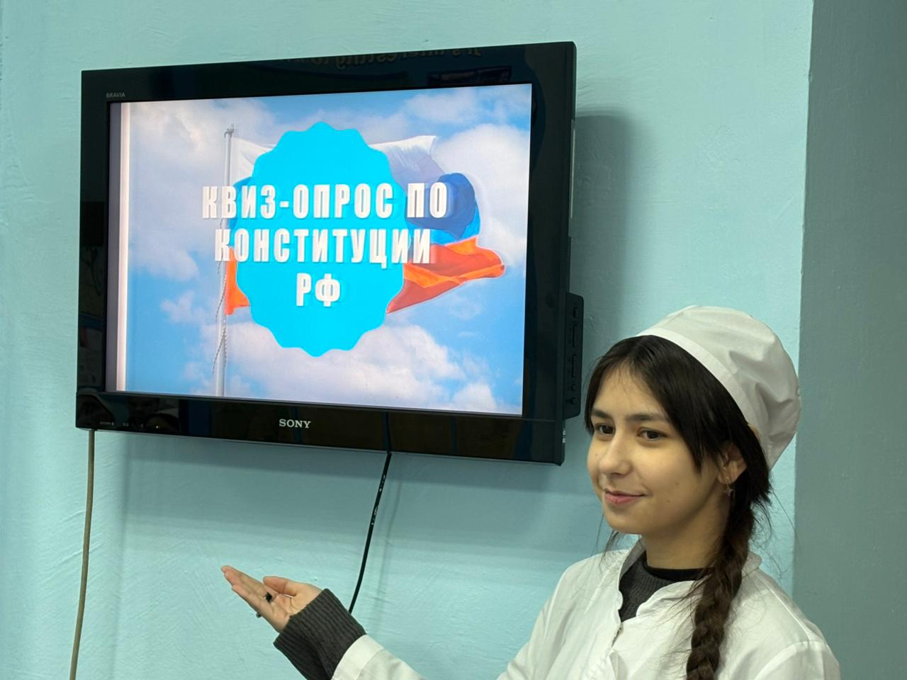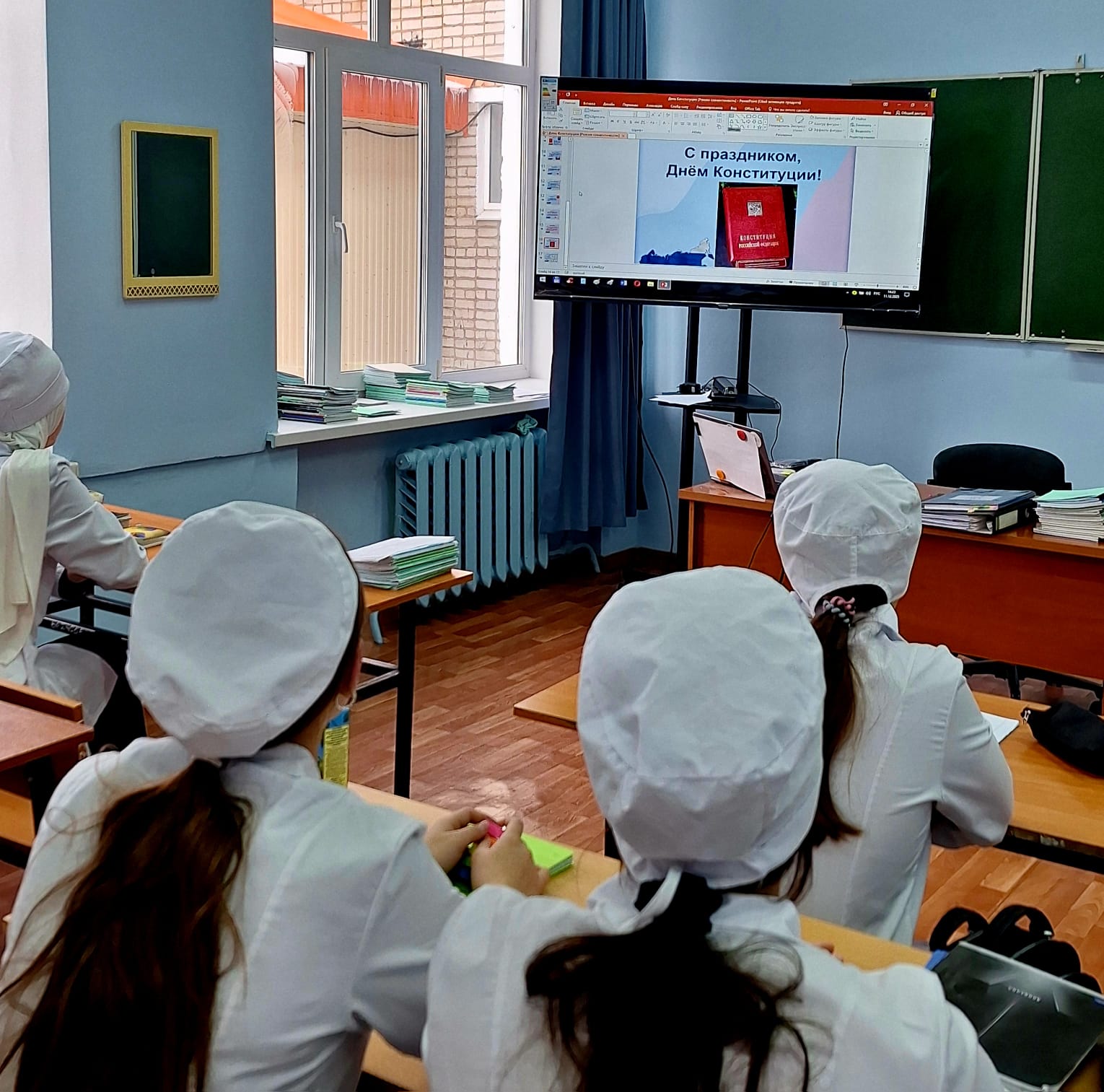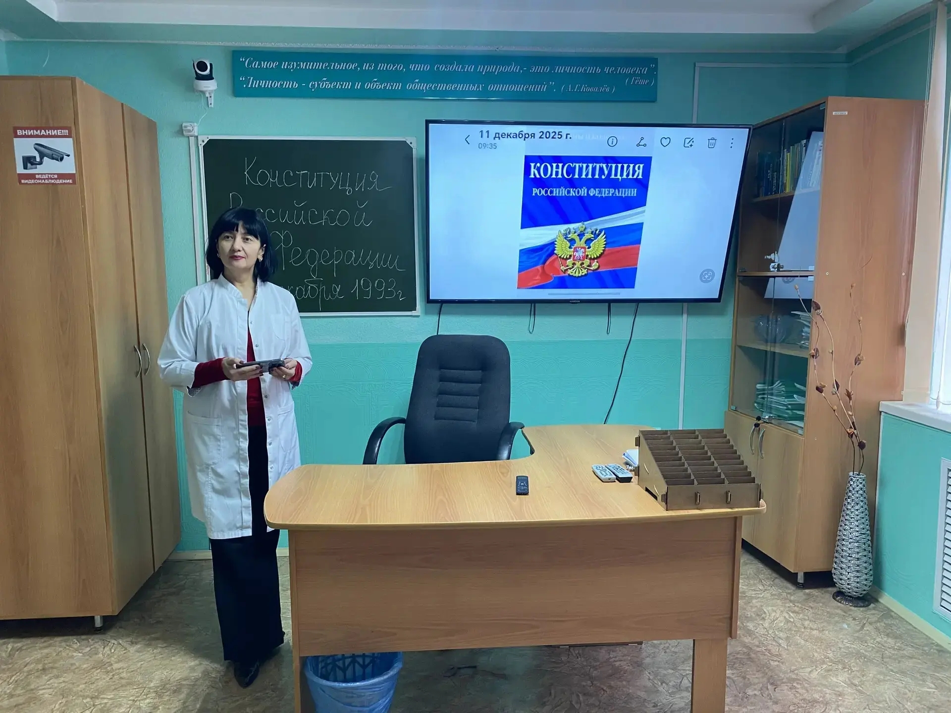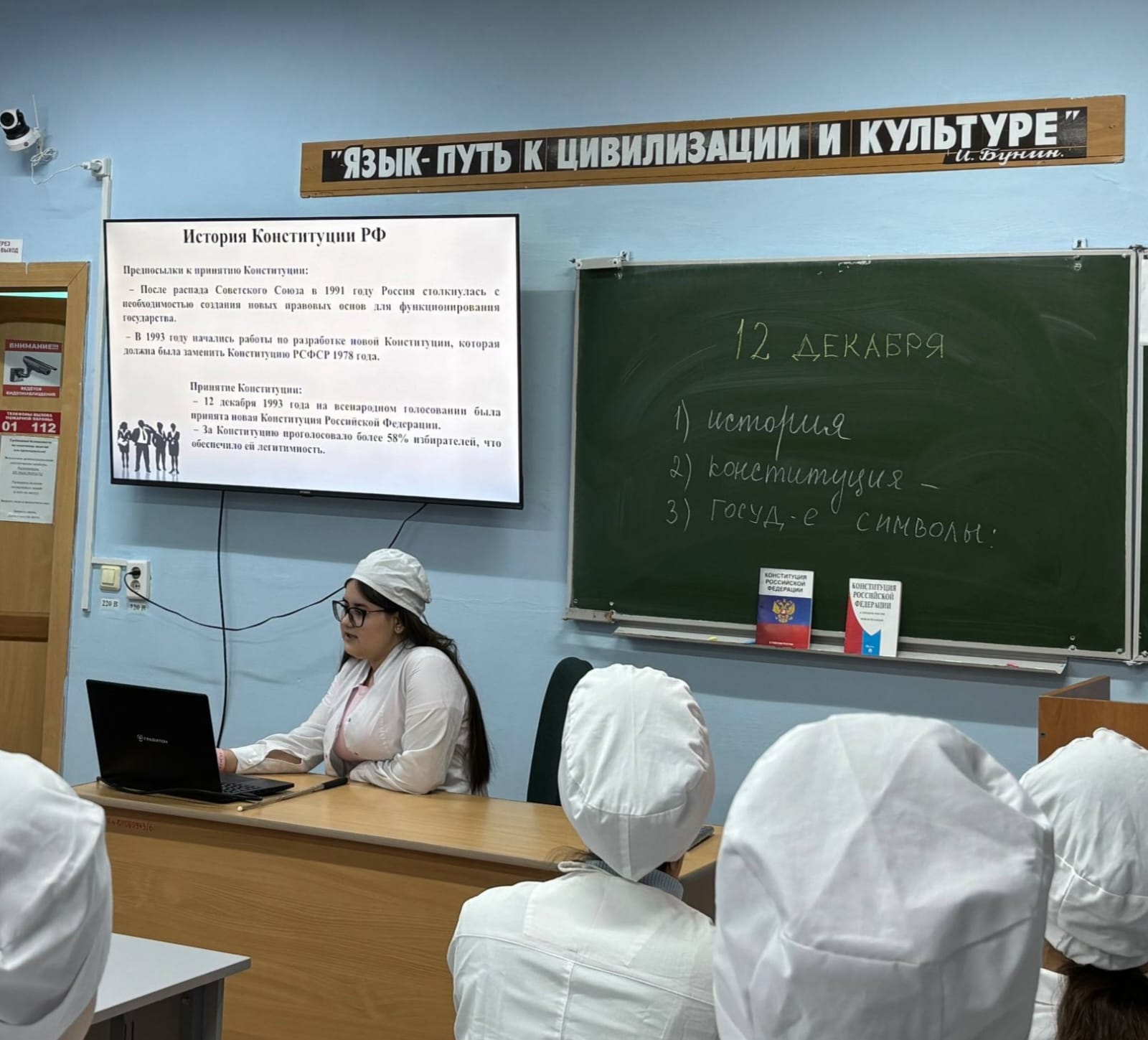 Конституция - основной и самый главный закон, который обеспечивает нам право на мирную, свободную и достойную жизнь. Она символизирует силу и независимость великой России и является ядром всей правовой системы. В Стерлитамаком медицинском колледже во всех группах проведены классные часы «Об истории Конституции», беседы, диспуты, круглые столы, диктанты.