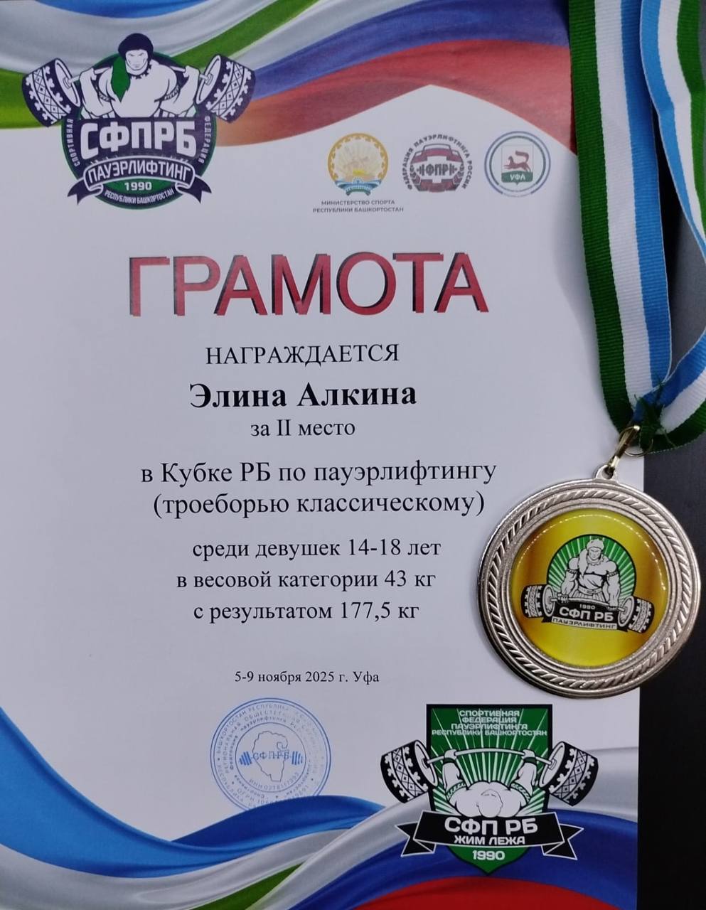 С 5 по 9 ноября в Центре спортивной подготовки Республики Башкортостан им. Римы Баталовой прошёл Кубок РБ по пауэрлифтингу среди девушек 14-18 лет. Студентка Стерлитамакского медицинского колледжа Алкина Элина заняла 2 место и прошла отбор на ПФО. Поздравляем с достойным результатом, желаем новых побед и силы духа! Пусть каждый подход приносит радость победы над собой, пусть рекорды покоряются легко, а тренировки приносят удовольствие и удовлетворение.
