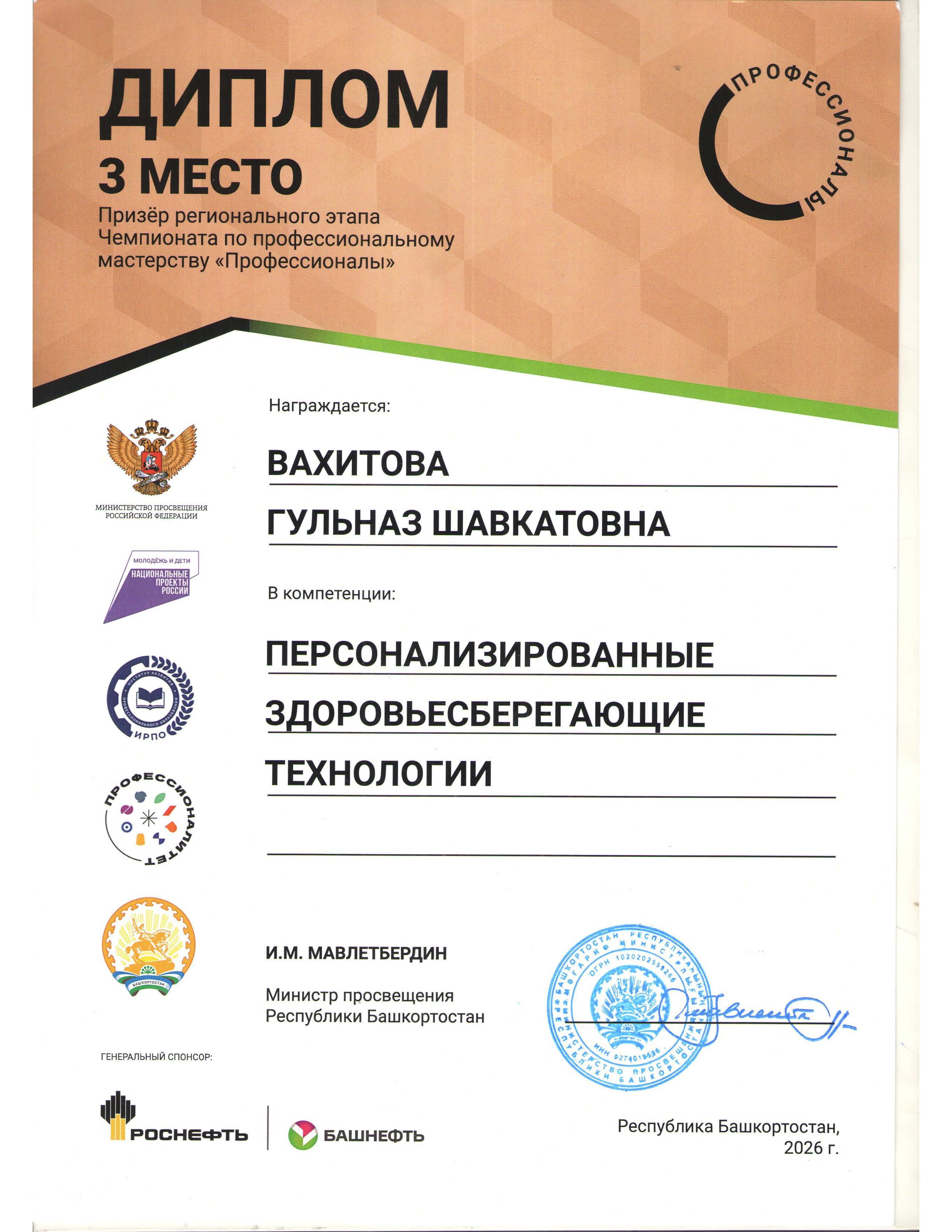 Обучающиеся ГАПОУ РБ «Стерлитамакский медицинский колледж» приняли участие в чемпионате по трем компетенциям. Вахитова Гульназ стала призером по компетенции «Персонализированные здоровьесберегающие технологии», заняв 3 место! Поздравляем участников, их наставников и всех кто вложил частицу своей души в подготовку конкурсантов, всем желаем дальнейших успехов!!! Пусть эта победа станет стимулом для новых свершений и достижений! Ведь сегодня лидером становится только тот, кто владеет знанием и мастерством.
