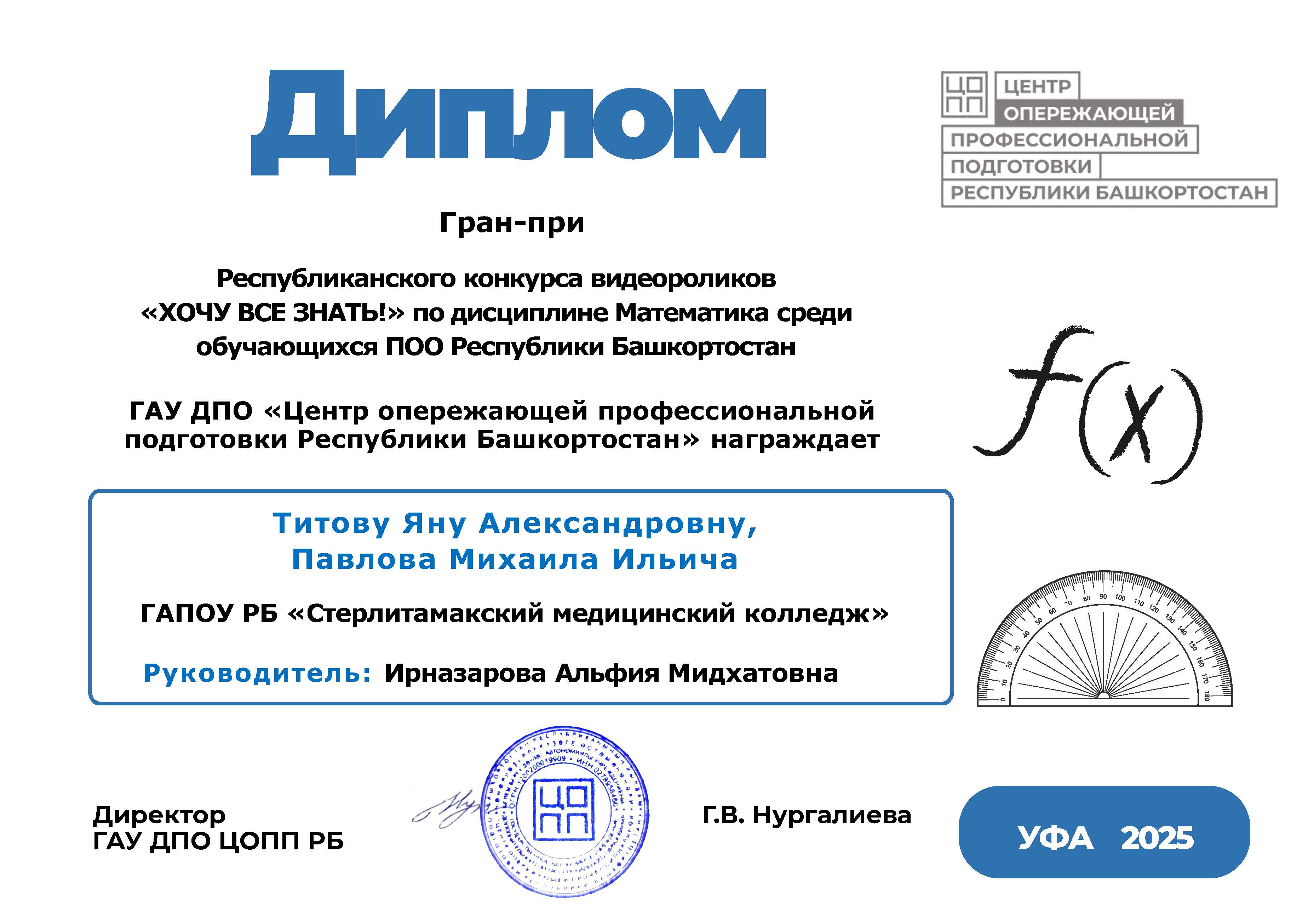 Подведены итоги Республиканского конкурса видеороликов «ХОЧУ ВСЕ ЗНАТЬ!» по дисциплине Математика среди обучающихся вторых курсов профессиональных образовательных организаций Республики Башкортостан.